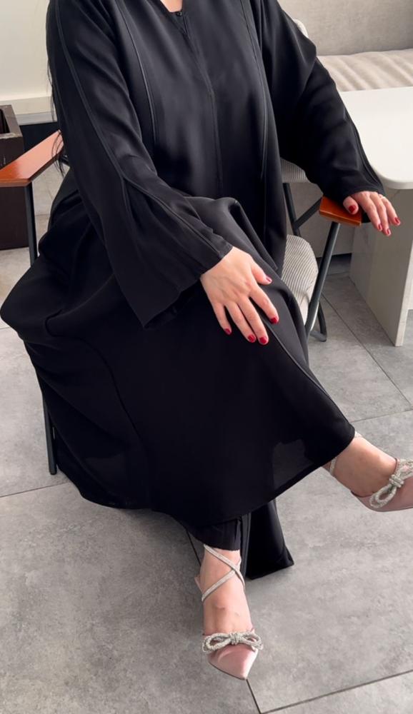 - عباية سوداء واسعة: خيطت هذه العباية من قماش الإنترنت عالي الجودة، وهو قماش متميز بخفته ونعومته على البشرة، مما يوفر لكِ شعورًا بالراحة والثقة أثناء ارتدائها طوال اليوم.