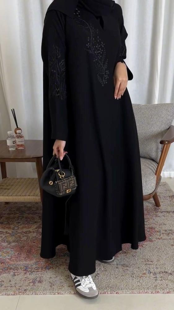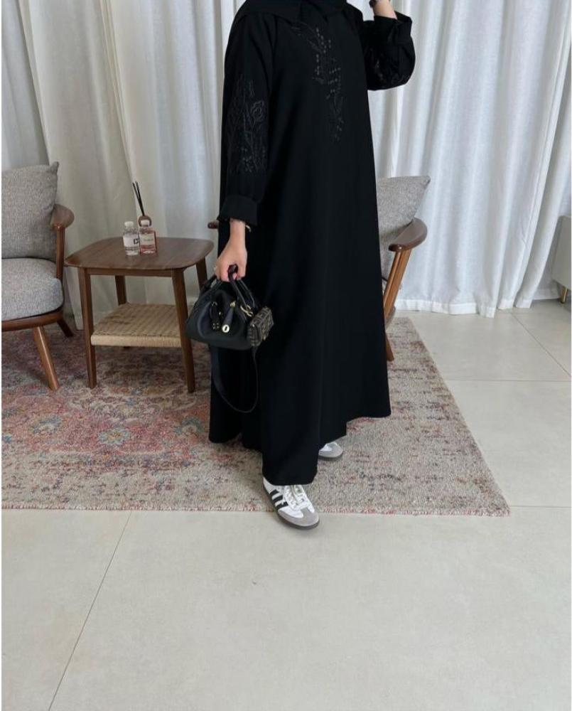الموديل: عبايه نص كلوش بتطريز اسود في الصدر واليدات