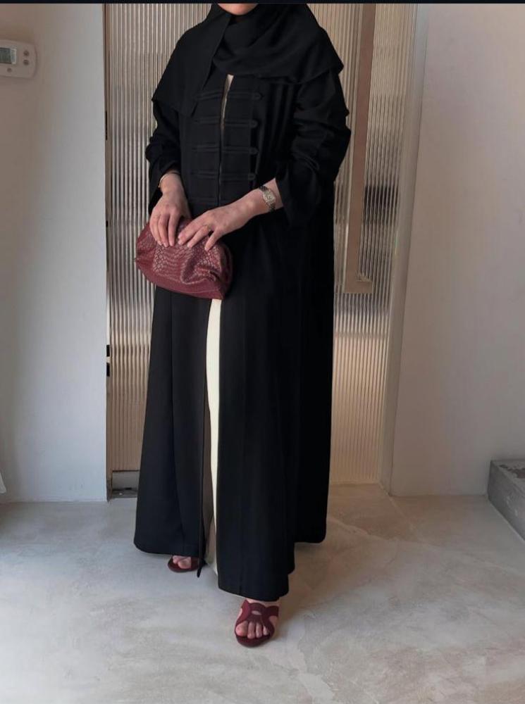 - عباية سوداء رسميه: خيطت هذه العباية من قماش كريب الرياض عالي الجودة، وهو قماش متميز بخفته ونعومته على البشرة، مما يوفر لكِ شعورًا بالراحة والثقة أثناء ارتدائها طوال اليوم.