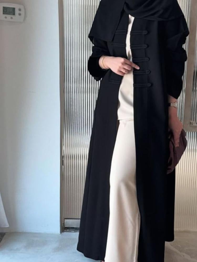 عباية سوداء رسميه بتصميم مبهر ستحظى معه بحرية الحركة والثقة في كل خطوة، فقد قام المصممون الخبراء بحياكتها من قماش كريب الر ياض عالي الجودة الذي يتميز بنسيجه الواقف والناعم على البشرة، مما يجعلها مناسبة للارتداء طوال اليوم حتى في أجواء الصيف الحارة.